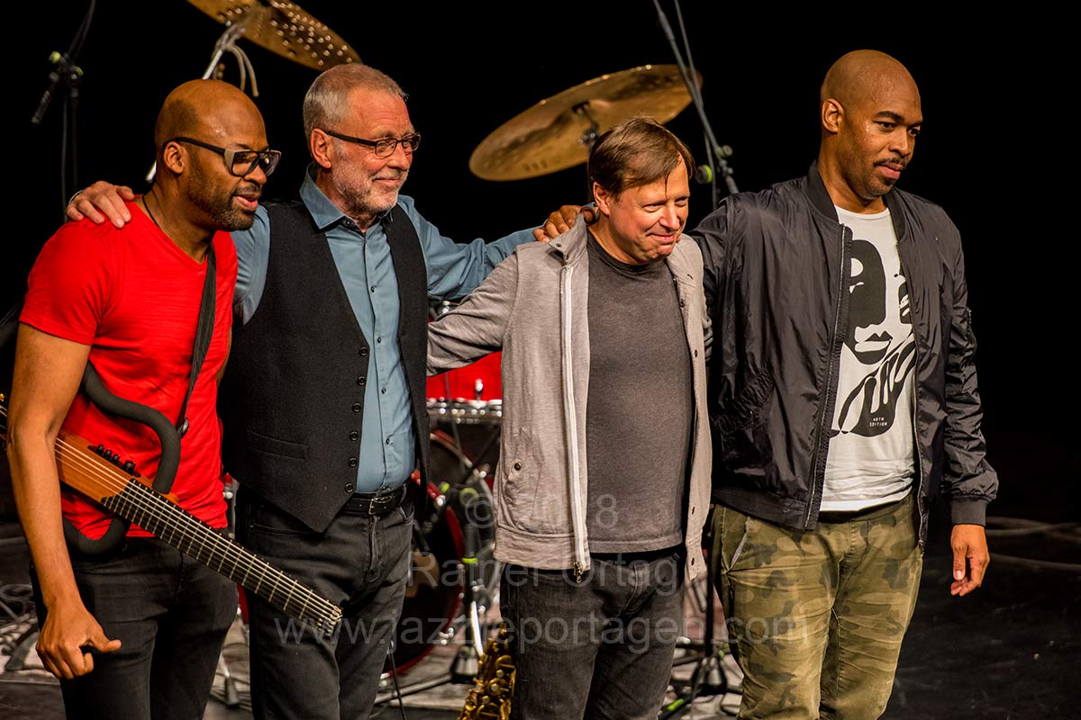 Lionel Loueke, guitar Dave Holland, bass Eric Harland, drums Aziza auf der Württembergischen Landesbühne Esslingen war der Höhepunkt des Jazzfestivals Esslingen 2018. Vier Spitzenmusiker haben sich zu dieser unglaublichen Band zusammengefunden. Der Kontrabassist Dave Holland, der Gitarrist Lionel Loueke, Saxophonist Chris Potter und der Schlagzeuger Eric Harland. Alle vier haben für diesen unglaublichen Konzertabend Kompositionen beigesteuert, die für dieses Quartett maßgeschneidert waren. Während "Aziza Dance" und "Sleepless Night" zum Tanzen einladen, wird man mit "Blue Sufi" hypnotisiert und bei "Aquila" mit Louekes Gesang in andere, ferne Sphären geholt. "Aziza" bezeichnet man in der westafrikanischen Mythologie eine wohltätiger und übernatürlicher Rasse, die normalerweise sehr versteck lebt und den Menschen spirituelle Kenntnisse vermittelt... Wir hatten das Glück, ein wenig davon zu erleben.