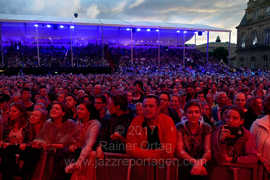 jazzopen stuttgart 2017Jamie Cullumam Schloßplatz Stuttgart am 12. Juli 2017Nach Auswahl eines Bildes bitte rechts oder links ins Foto klicken oder Taste → und ← zum blättern.Tom Richards, sax, keys Rory Simmons, trumpet, electronics, guitars Loz Garratt, bass Brad Webb, drums und Extra Horns Tom Rees Roberts, Tom Walsh, tr Nichol Thomson, Jon Stokes, tb Simon Allen, Ben Castle, sax Jamie Cullum stürmte die Bühne und stand mit einer Snare Drum vor seinem treuen Publikum. Von der ersten Sekunde haute die zehn Mann Band auf die Pauke, und Jamie Cullum vorerst nicht in die Tasten sondern auf die beidseitig bespannte Snare Drum. "Just the same thing" war der Titel, mit dem die Party eröffnet wurde. Der Bläsersatz der Band ließ die Herzen der Jazzliebhaber höher schlagen, da es regelmäßig Soli von Saxophon, Posaune und Trompete gab - und was für Soli! Stets energetisch und auf den Punkt gespielt; so auch Jamie Cullum, als dieser zum Flügel wechselte. Relativ früh spielten er seinen Gassenhauer "Please don´t stop the music", wo stets das Klavier Solo im Mittelpunkt steht. Auffällig an Jamie´s Weise zu isolieren ist, dass jeder Ton komplett überzeugt gespielt wird, was sicherlich auch seinem härteren Anschlag zu geschuldet ist. Tatsächlich sind manche Runs harmonisch fragwürdig, das fällt aber nicht wirklich auf, da er jeden Ton überzeugt spielt, als ob er genau dahin gehöre. Nicht zuletzt ist zu erwähnen, dass Jamie auch gerne beissende Intervallstrukturen benutzt, die an den legendären Jazzpianisten Thelonious Monk erinnern. Später folgte auch eine Solo Piano Einlage bei der er Stride Piano spielt, auch hier schlugen die Herzen von Pianisten höher. André Weiß