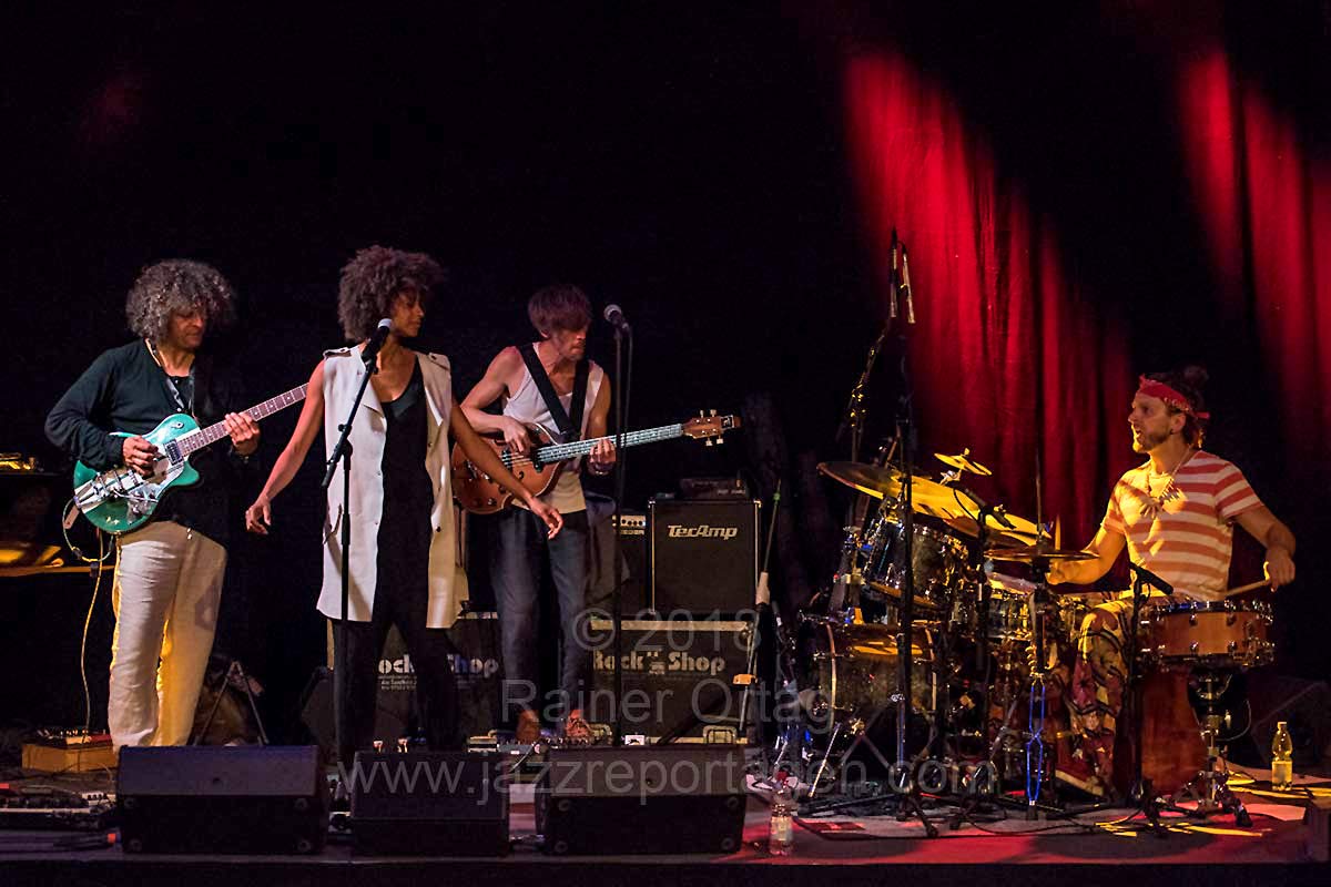 jazzopen stuttgart 2018Bodek Janke - global.dance.kultureim Stadtpalais Stuttgart am 18. Juli 2018Nach Auswahl eines Bildes bitte rechts oder links ins Foto klicken oder Taste → und ← zum Blättern.Shishani Vranckx, voc, guitar Kristjan Randalu, piano Thomas Maos, guitar Philip Donkin, bass Große Namen tauchten in diesem Jubiläumsjahr im Programm der 25. Stuttgarter Jazzopen auf - und leider waren dementsprechend auch viele Konzerte recht teuer. Zu teuer für viele, die durchaus interessiert waren am musikalischen Angebot. Dass die Stadt mehrere attraktive Veranstaltungsorte kostenlos zur Verfügung stellte, ermöglichte es den Organisatoren, auch für diese Klientel täglich mehrere kostenlose Jazzkonzerte auszurichten. Dass dabei keinesfalls zweitklassige Musik erklang, konnte man immer wieder überrascht erleben. Als Beispiel soll hier der Auftritt von Bodek Janke mit seinem Ensemble SONG & global.dance.kulture am 18. Juli im Stadtpalais dienen; in der tollen Atmosphäre der ehemaligen Stadtbibliothek boten der 1979 in Warschau geborene Schlagzeuger Bodek Janke mit seiner neuen Gruppe eine rasante Mischung aus eingängigen Melodien und improvisierter Jazz- und Weltmusik auf allerhöchstem Niveau. Die immense Spielfreude, der enge Kontakt zum Publikum und die Lust an improvisatorischen Elementen begeisterten die Anwesenden von der ersten Minute an. Die wunderbare Stimme der namibianischen Sängerin und Gitarristin Shishani Vranckx wurde begleitet vom estnischen Pianisten Kristjan Randalu, dem britischen Kontrabassisten Philip Donkin, dem Tübinger Gitarristen Thomas Maos und eben Bodek Janke am Schlagzeug. Die zahlreichen Besucher erlebten an diesem Abend ein Jazzkonzert, das den Vergleich mit teuren Top-Acts auf keinen Fall scheuen musste - ganz im Gegenteil! Markus Minberg