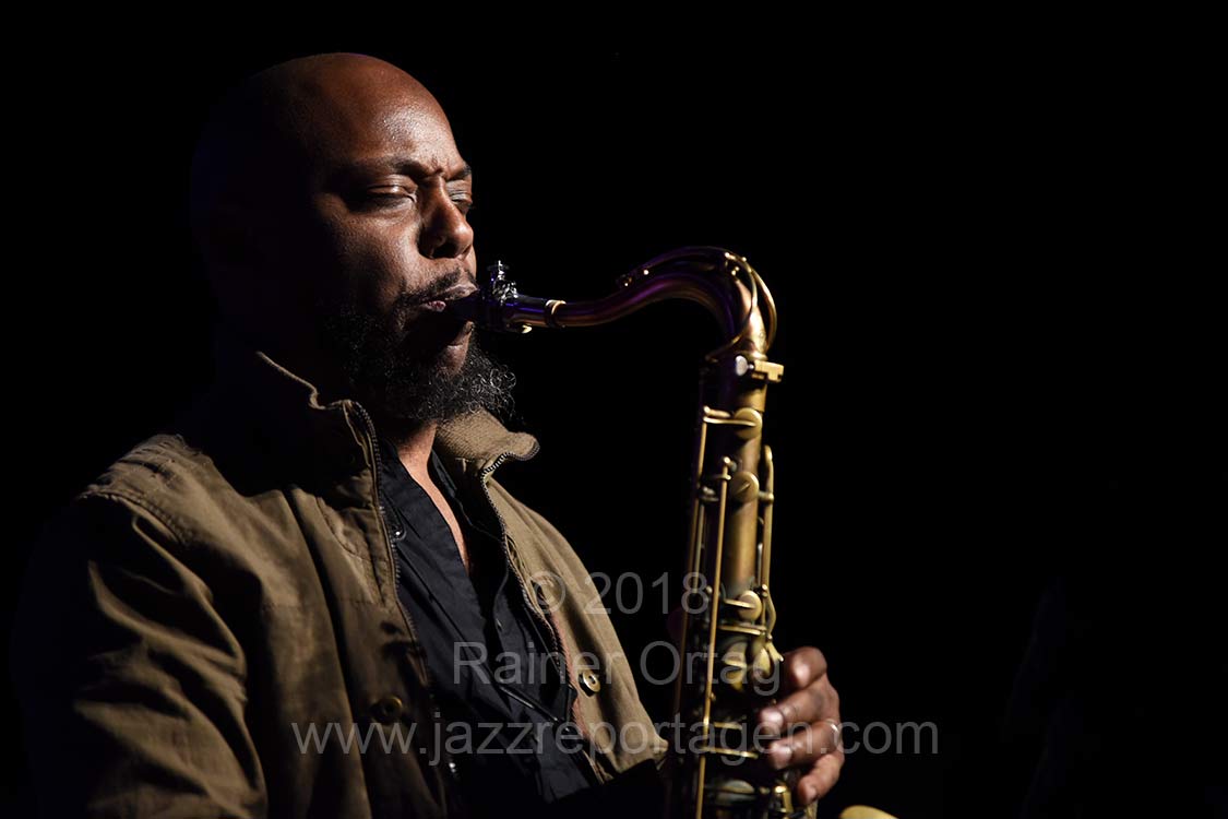 Marcus Strickand's Twi-Life Quartetim Sudhaus Tübingen am 7. April 2018Nach Auswahl eines Bildes bitte rechts oder links ins Foto klicken oder Taste → und ← zum Blättern.Mitch Henry, keys Kyle Miles, bass Jonathan Barber, drums Schlagkräftiger Sound Marcus Strickland's Twi-Life mischen mit ihrem Funkjazz-Mix das Tübinger Sudhaus auf Keine Frage, die Band Twi-Life um den New Yorker Saxofonisten Marcus Strickland hat musikalisch einiges drauf - und sie steht nicht zuletzt für einen bezwingenden Neuerergeist. Der zweistündige Auftritt im Sudhaus gestaltete sich jedenfalls wach, explosiv und voller Überraschungen. Nicht ohne Grund gehört Marcus Strickland seit Jahren zur renommierten Blue Note Allstar Band und wird als einer der aktuellen Shootingstars der New Yorker Jazzszene bezeichnet. Er ist der Kopf dieses explosiven Quartetts. Er hält die Fäden in der Hand, ist für so gut wie alle Kompositionen zuständig und sorgt dafür, dass die drei anderen, sehr differenten Charaktere an einem Strang ziehen. Sein kräftiger Saxofonklang ist nicht nur unverwechselbar, akzentuiert und eindringlich, sondern kann auch stählern und schneidend sein. Man spürt, dass sorgfältig an ihm geschliffen wurde und dass der 39-jährige Saxofonist nicht nur viele Töne spielen kann, sondern auch die Kunst beherrscht, sich zum richtigen Moment zurückzunehmen. Von Beginn an produziert das Quartett bei seinem Sudhaus-Auftritt einen schlagkräftigen Sound, der auf das Auditorium förmlich losspringt und vom ersten Takt an klar macht, worum es hier in den nächsten zwei Stunden gehen wird: um jede Menge Virtuosität, Rhythmus und die reine Lust am Spiel. Die Vier lieben es, ihre Musik an die Ränder zu treiben, wo die Konturen ausfransen, die Töne kippen und die Klangschärfe bedrohlich zunimmt. Unplugged ist die Sache von Marcus Strickland's Twi-Life jedenfalls nicht. Auch nicht Understatement. Sie wollen zeigen, was sie können. Und das ist einiges. Mal jagen Saxofonist Strickland, Organist und Keyboarder Mitch Henry, Bassist Kyle Miles und Drummer Jonathan Barber die Klänge an ihre Grenzen, im nächsten Moment streuen sie Hip-Hop-, Afrobeat- oder gar kurze Volksmusik-Anleihen von Béla Bartók ein. Alles ist auf Vielfalt ausgelegt und atmet die Sehnsucht nach einer neuen Freiheit jenseits des totgelaufenen Free Jazz. Doch trotz aller Grenzenlosigkeit bleibt der Jazz immer funky und es pulsiert stets ein unwiderstehlicher Rhythmus im Untergrund. Strickland präsentiert sich nicht als Zehnkämpfer seines Fachs, sondern als filigraner Strippenzieher, der weiß, wann er die entscheidenden Akzente setzt. Einer, der nicht zur Ruhe kommt, der unentwegt zündelt, der Feuer legt und Großbrände verantwortet. Seine drei Mitstreiter, vor allem Organist und Keyboarder Mitch Henry, denken gar nicht daran, Strickland in seinem Expansionsdrang einzudämmen. Im Gegenteil. Sie gießen Öl ins Feuer, das er entfacht und offenbaren dabei eine gestalterische Kraft, die es wirklich nur im Jazz gibt. Dennoch wenden sich ein paar Besucher verschreckt ab vor so viel trunkener und zuweilen auch lautstarker Spiellust und verlassen das Konzert vor der Zugabe. Jedenfalls sind sie zu früh gegangen. Denn zum Schluss werden die Töne nochmal smoother, weicher und samtener. Jürgen Spiess