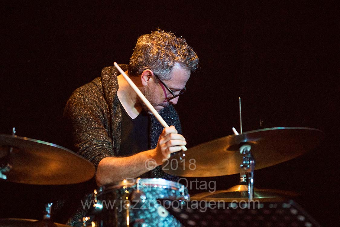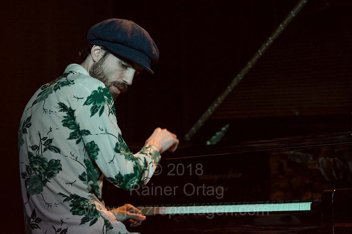 Or Bareket Quartetim Pappelgarten Reutlingen am 27. Januar 2018Nach Auswahl eines Bildes bitte rechts oder links ins Foto klicken oder Taste → und ← zum Blättern.Shachar Elnatan, guitar Nitai Hershkovits, piano Ziv Ravitz, drums Bei dieser ersten Europatour als Bandleader präsentiert der junge Bassist Or Bareket, als einer der gefragtesten und vielseitigsten Bassisten der New Yorker Jazz-Szene, im ausverkauften Pappelgarten eigene Kompositionen und spannend interpretierte Standards. Mit von der Partie ist der versierte und berühmte Ziv Ravitz am Schlagzeug, der lange Zeit Duopartner von Yaron Herman war. Am Piano der beeindruckend talentierte Nitai Hershkovits, der für einige Zeit auch Pianist in Avishai Cohens Trio war. Als Gitarrist stellt sich Shachar Elnatan vor, der Jüngste der Band, der u.a. bei Peter Bernstein studiert hat. Gemeinsam gehen diese vier Musiker eine ganz neue und spannende Verbindung ein: folkloristisch und individuell zugleich. Seit seinem Umzug nach New York im Jahr 2011 hat Bareket mit zahlreichen Künstlern aus der ganzen Welt gespielt, aufgenommen und getourt. Namhafte Kollaborationen schließen Ari Hoenig, Jean-Michel Pilc, Aaron Goldberg, Sam Yahel, Jacques Schwartz-Bart, Camila Meza u.v.m. ein. Sein Ansatz zur Improvisation steht unter dem Einfluss mediterraner, südamerikanischer und nordafrikanischer Folklore, interpretiert durch ausgeprägte Fachkenntnisse und seine tiefe Wertschätzung der amerikanischen Jazztradition. Dabei sind seine kulturellen Wurzeln in seinem Spiel stets präsent, diese Ingredienzen fließen hörbar in seine Kompositionen ein und verzaubern das Publikum. Sein Debütalbum "OB 1" , letzten September beim Label Fresh Sound New Talent Records erschienen, war an diesem Abend sehr schnell ausverkauft. Martina Hampe