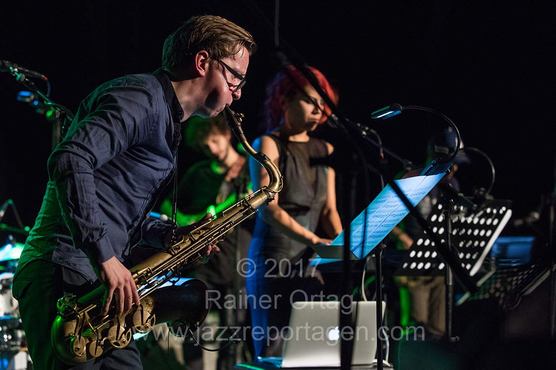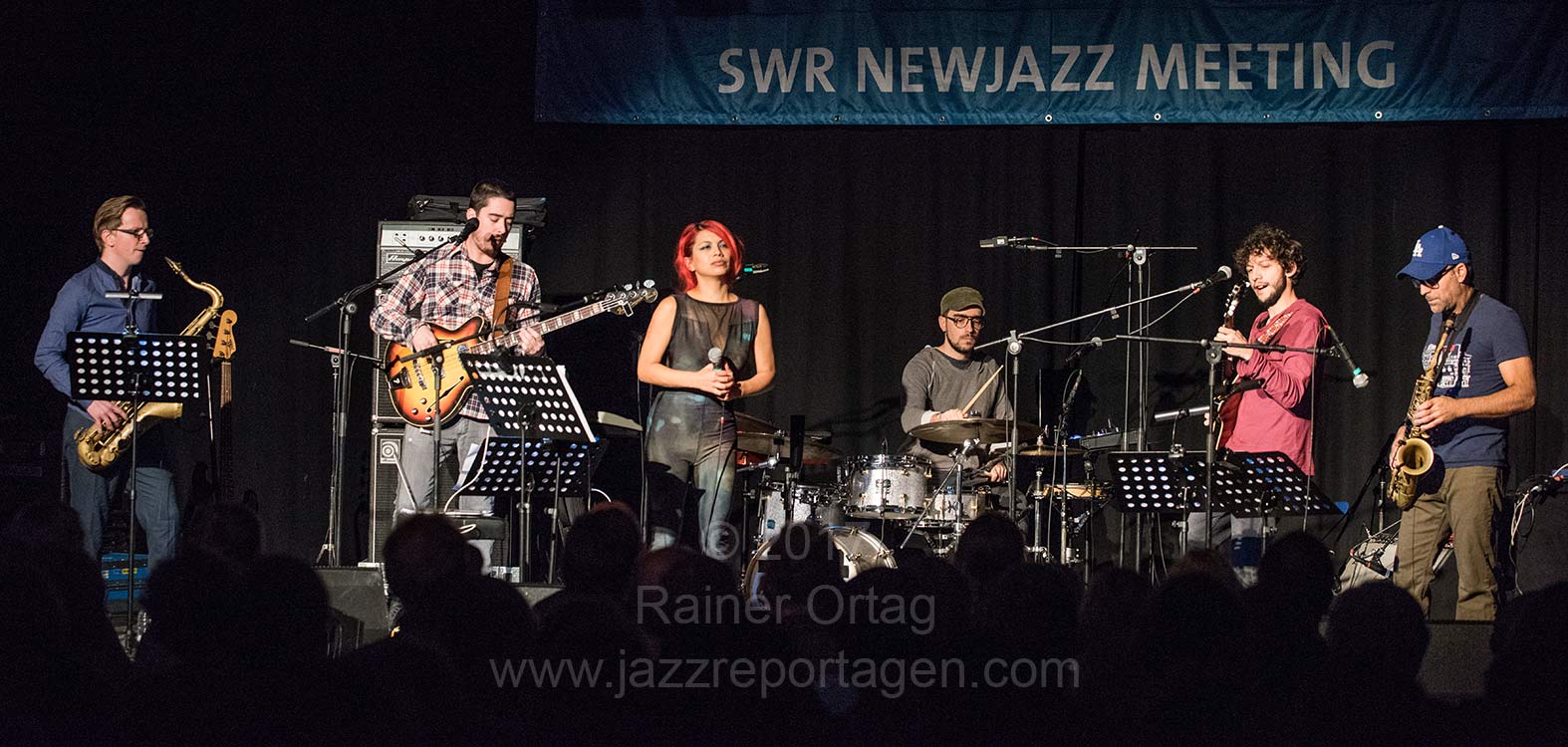 SWR NEWJazz Meeting 2017Spider's Eggim Sudhaus Tübingen am 25. November 2017Genevieve Artadi, Vocals, Keyboards David Binney, Altsaxofon Sebastian Gille, Tenorsaxofon Frederico Heliodoro, Elektro-Bass Antonio Loureiro, Schlagzeug Kollaboratives Klang- Projekt mit formidablen Solisten!Wie jedes Jahr öffnet SWR2 seine Überraschungskiste NEWJazz Meeting und niemand weiß, was zu erwarten ist. Doch das ist gerade das Spannende: Der SWR stellt eine Band zusammen, die in dieser Form noch nie zusammengespielt hat. Das Experiment (einige Probetage im Studio, dann gemeinsame Auftritte) gelingt nun schon seit 50 Jahren. "Jazz-papst" Joachim Ernst Berendt kreierte dieses Format und verhalf so vielen unbekannten Musikern zum Durchbruch, es sei nur Bobby McFerrin erwähnt."Spider's Egg" nennt der diesjährige Kurator, der 24-jährige Gitarrist Pedro Martins aus Brasilia sein kosmopolitisches Projekt, das er mit zwei weiteren brasilianischen Musikern (Frederico Heliodoro und Antonio Loureiro), David Binney aus New York und Sebastian Gille aus Köln (!) zusammengestellt hat. Optisch und musikalisch bereichert wird diese Assemblage durch die angesagte Elektro-Pop Chanteuse Genevieve Artadi aus Los Angeles, bekannt aus ihrem Pop-Duo "Knower" und der Zusammenarbeit mit "Snarky Puppy"... Ausgerechnet Altsaxophonist David Binney, der "Altmeister" in der blutjungen Band, eröffnet das Konzert mit einigen kratzigen, elektronischen Loops aus der Laptop-Konserve, doch - oh Jazzwunder - Pedro Martins übernimmt mit seiner swingenden, perlenden Gitarre das Vorspiel und entführt die Zuhörer mit sambaähnlichen Melodien nach Brasilien. Untermalt wird "Fuki's tune" mit Vocals diverser Musiker - natürlich auch mit der Stimmen der Sängerin Genevieve Artadi, die immer mehr in den Blickpunkt rückt. Wann sieht man schon mal eine Band mit zwei Saxophonisten, die auch so unterschiedlich spielen und doch unheimlich gut zusammenarbeiten. Dem jungen Tenorsaxophonisten Sebastian Gille zuzuhören und zuzusehen macht Spaß. Er holt das Letzte aus sich heraus, spielt gebückt voller Inbrunst; mal volle Lautstärke, mal überbläst er sein Instrument ganz zart. Beeindruckend! Der heimliche Star, David Binney am Altsaxophon, der Mastermind hinter der letzten CD "Black Star" von David Bowie, stellt sich ganz in den Dienst des Kollektivs, aus dem keine(r) herausragt. "Es wird ein sehr kollaboratives Projekt werden. Neben mir werden alle Musiker eigenes Material einbringen", meint Pedro Martins. Und so ist es auch, alle Musiker steuern eigene Kompositionen bei, die meisten unter der Mitarbeit von Artadi, die gelegentlich auch in das Keyboard greift. Das anfangs noch sperrige Musik-Gebilde beginnt zu grooven, die beiden Saxophonisten und die exzellente Rhythmusgruppe, vor allem Antonio Loureiro am Schlagzeug, heben ab. Die Sängerin legt sich mit ihrer fragilen, oft nur gehauchten Stimme lautmalerisch darüber, unterstützt von den beiden "Background"- Vokalisten Martins und Frederico Heliodoro (E-Bass), der mit seinem kreativen Spiel weit mehr als nur Rhythmus abliefert. Die Band kann aber auch stimmungsvolle, ruhigere Stücke voller Atmosphäre wie "Winter" von Sebastian Gille. Es ist schier unglaublich, dass den Musikern in nur wenigen Probetagen ein solch intensiver; abwechslungsreicher, Stile und globale Grenzen überspringender Mix modernster Großstadtmusik gelungen ist. Schade nur, dass diese formidable Band wohl nie wieder in dieser Besetzung zusammenspielen wird - aber einen Trost gibt es: Der SWR hat natürlich mitgeschnitten, wird das Beste aus den drei Konzerten senden und auch eine CD wird daraus destilliert. Immerhin etwas was bleibt! Helmut Hugo Burkhardt